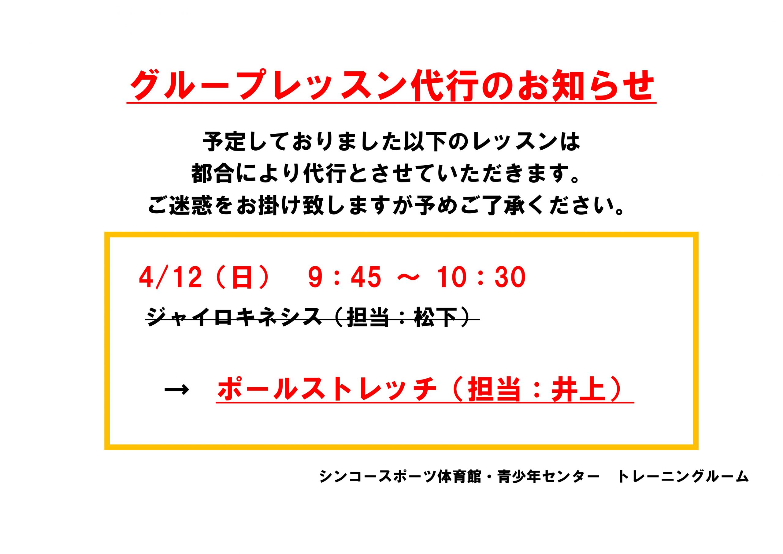 4月12日(日)グループレッスン一部変更のお知らせ
